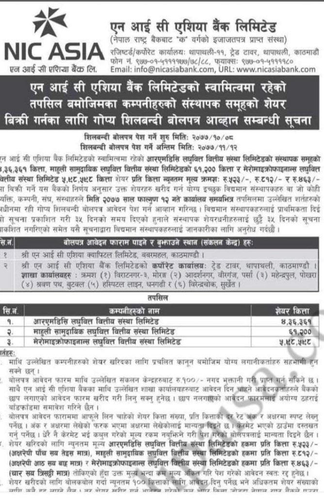 एनआईसी एशिया बैंकले आफ्नो स्वमित्वमा रहेको तीन ओटा कम्पनीको संस्थापक शेयर आजदेखि लिलामीमा विक्री खुला गरेको छ ।बैंकले आफ्नो स्वामित्वमा रहका आरएमडिसी लघुवित्त वित्तीय संस्था, महुली सामुदायिक लघुवित्त र मेरो माइक्रोफाइनान्स लघुवित्त वित्तीय संस्थाको संस्थापक शेयर बिक्रि गर्ने भएको हो ।