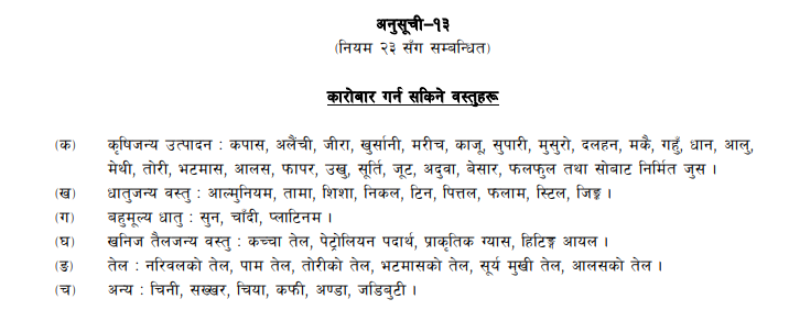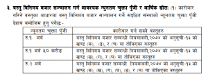 कृषिजन्य उत्पादन, तेल र अन्य बस्तुहरुको मात्रै कारोबार गर्ने कमोडिटी एक्सचेन्ज स्थापनाका लागि न्युनतम चुक्ता पूँजी एक अर्ब रुपैयाँ तोकिएको छ । धातुज्नय बस्तु, बहुमूल्य धातु र खनिज तैलजन्य बस्तुको कारोबार गर्ने कमोडिटी एक्सचेन्जका लागि न्युनतम चुक्ता पूँजी एक अर्ब ५० करोड रुपैयाँ लाग्ने व्यवस्था गरिएको छ ।