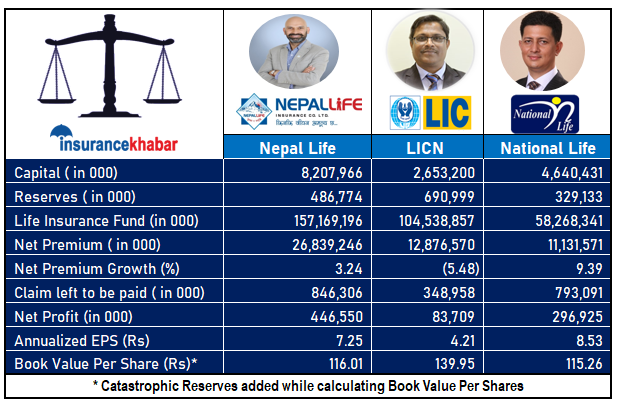 काठमाडौं । नेपाल लाइफ इन्स्योरेन्स, नेशनल लाइफ इन्स्योरेन्स र लाइफ इन्स्योरेन्स कर्पोरेशन नेपाल (एलआईसी नेपाल) नेपालमा स्थापित र तीन ठूला जीवन बीमा कम्पनीमा पर्दछन । तीन कम्पनीहरुले आर्थिक वर्ष ७९/८० को तेश्रो त्रैमासको (९ महिना) वित्तीय विवरण सार्वजनिक गरेको अवस्था छ । नेपाल लाइफ इन्स्योरेन्स, नेशनल लाइफ इन्स्योरेन्स र लाइफ इन्स्योरेन्स कर्पोरेशन (नेपाल) कम्पनीलाई इन्स्योरेन्स खबर टिमले गरेको तुलनात्मक अध्ययन :