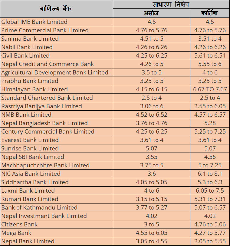 तर कात्तिक महिनामा भने प्राइम, नविल, सिभिल, एनसिसि, कृषि विकास बैंक, हिमालयन, स्ट्याण्डर्ड चार्टर्ड, राष्ट्रिय बाणिज्य बैंक, एनएमबी बैंक, नेपाल बंगलादेश बैंक, सेञ्चुरी बैंक, नेपाल एसबिआई बैंक, माछापुच्छ्रे, एनआईसी, सिद्धार्थ, लक्ष्मी, कुमारी बैंक, बैंक अफ काठमाण्डू र सिटिजन बैंकहरुले बढाएका छन् । बैंकिङ प्रणालीमा समय समयमा तरलताको समस्या देखापरिरहन्छ । तरलता अभावको संकेत देखिने वित्तीकै बैंकहरुमा निक्षेप तानातानको अवस्था सिर्जना हुने गर्छ ।