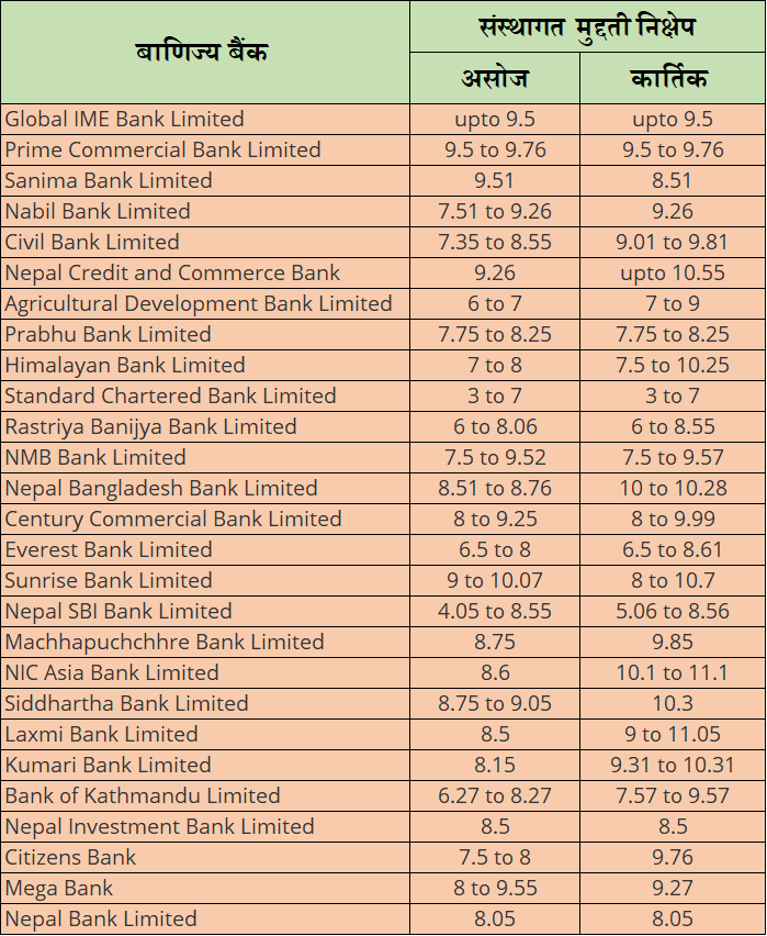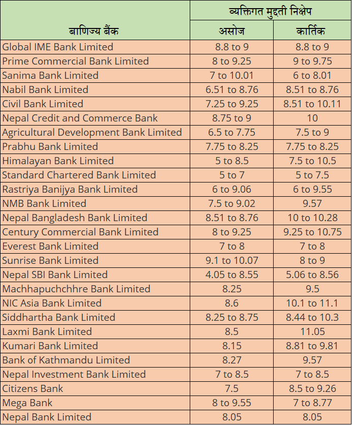 काठमाडौं । कात्तिक महिनाको लागि १९ वटा बाणिज्य बैंकहरुले साधारण र मुद्दती निक्षेपको व्याजदर बढाएका छन् । मुद्दती निक्षेपको व्याजदर सँगै ऋणको व्याजदर पनि बढाएका छन् । गएको महिनामै व्याजदर बढाएका बैंकहरुको आधार व्याजदर पनि बढेको छ । आधार व्याजदर बढ्ने वित्तीकै कर्जाकोको व्यजदर स्वत बढ्छ । कात्तिक महिनाका लागि बढाएको व्याजदरले आगामी महिनामा पनि बढ्ने संकेत गरेको छ ।