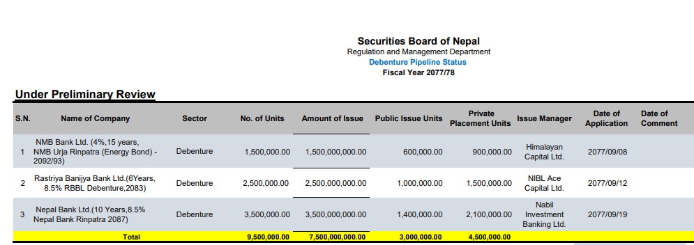 राष्ट्रिय वाणिज्य बैंकले ८ दशमलव ५ प्रतिशत ब्याजदरमा २५ लाख ईकाई २०८३ सम्मका लागि ऋणपत्र निष्कासन गर्नका लागि निवेदन दिएको छ । त्यस्तै, नेपाल बैंकले ८ दशमलव ५ प्रतिशत ब्याजदरमा २०८७ सम्मका लागि ३५ लाख ईकाई ऋणपत्र निष्कासन गर्नको लागि सेबोनमा निवेदन दिएको हो ।