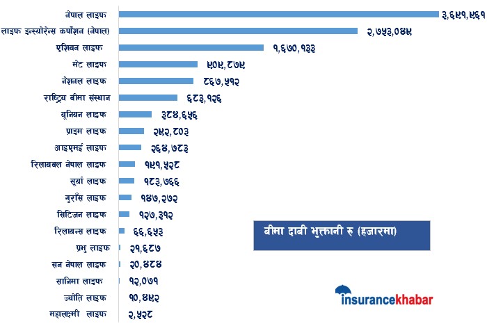 कम्पनीहरुले प्रकाशन गरेको वित्तीय विवरण अनुसार मेट लाइफले ९० करोड ९८ लाख रुपैयाँ, नेशनल लाइफले ८६ करोड ७५ लाख रुपैयाँ, सरकारी स्वामित्वमा रहेको राष्ट्रिय बीमा संस्थानले ६८ करोड ३१ लाख रुपैयाँ, युनियन लाईफकले ३८ करोड ४६ लाख रुपैयाँ, प्राइम लाईफले २९ करोड २८ लाख रुपैयाँ, आइएमई लाइफले २६ करोड ४७ लाख रुपैयाँ र रिलायबल नेपाल लाइफको १९ करोड १५ लाख रुपैयाँ बीमा दाबी भुक्तानी गरेका छन् ।