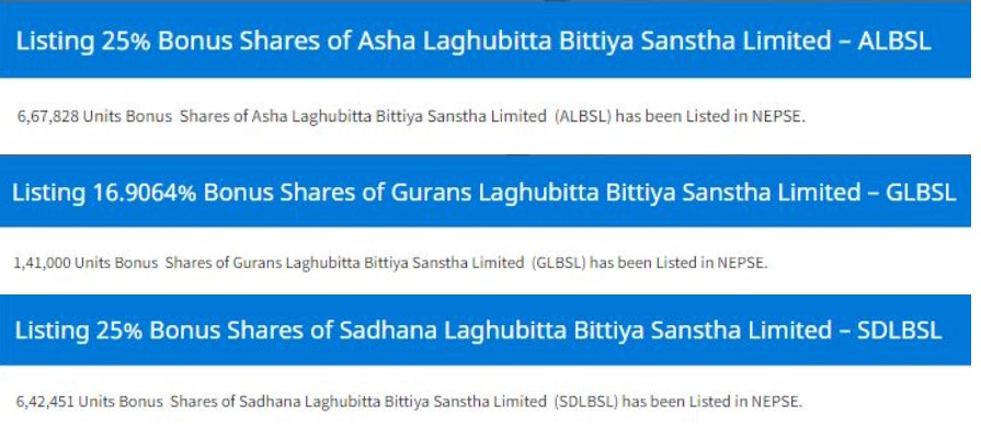 काठमाडौं । आज नेप्सेमा तीन लघुवित्तको बोनश शेयर सूचिकृत भएको छ । आज गुँरास लघुवित्त, साधना लघुवित्त र आशा लघुवित्त वित्तीय संस्थाको शेयर सूचिकृत भएको हो ।