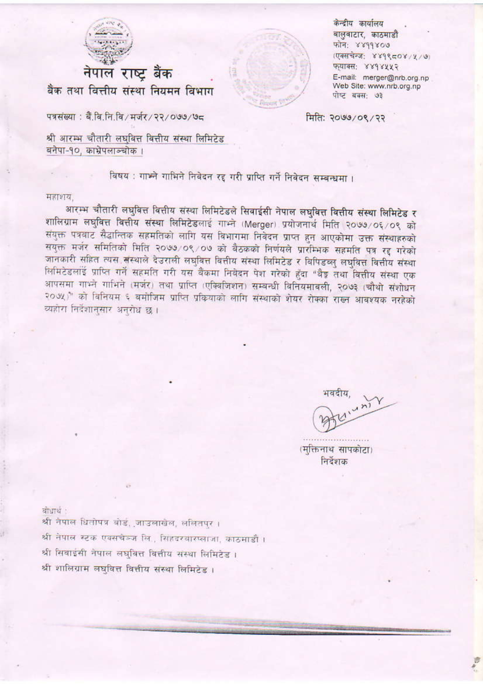 काठमाडौँ । आरम्भ चौतारी लघुवित्त वित्तीय संस्था लिमिटेडले दुई लघुवित्तलाई प्राप्ती गर्ने मर्जर सम्झौता रद्द गरेको छ । लघुवित्तले सिवाईसी नेपाल लघुवित्त र शालिग्राम लघुवित्तसँग मर्जर सम्झौता गरेकोमा यी तीनै पक्षले मर्जर सम्झौता रद्द गरेका हुन् । मर्जर सम्झौता रद्द भएसँगै आरम्भ चौतारीको शेयर कारोबार फुकुवा भएको छ ।