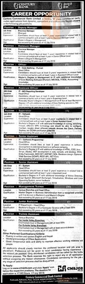 यस्तै, सेञ्चुरी बैंकले पनि काठमाडौं उपत्यका भित्रका ब्यवस्थापन विषयमा ५५ प्रतिशत अंक र काठमाडौं बाहिरकालाई ४५ प्रतिशत अंक ल्याएर प्लसटु लेभल उत्तिर्ण गरेको ट्रेनी असिस्टेन्टमा १ सय २५ जना कर्मचारी माग गरेको छ । साथै बैंकले सुचना प्रविधि विभागका लागि आइटीमा स्नातक गरेको ५ जना जुनियर असिस्टेन्ट थप मागेको छ ।
