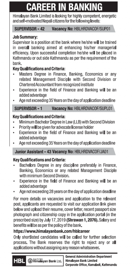 यसैगरि हिमालयन बैंकले पनि ४२ जना सुपरभाइज माग गरेको छ । स्नातकोत्तर गरेको र बैंकिङमा अनुभव भएकालाई बैंकले नियुक्त गर्ने जनाएको छ । बैंकले ४३ जना जुनियर असिस्टेन्ट नियुक्त गर्ने भएको छ । यसका लागि स्नातक भए पुग्छ भने बैंकले कानुन तिर पनि एक जना सुपरभाइजर नियुक्त गर्ने जनाएको छ ।