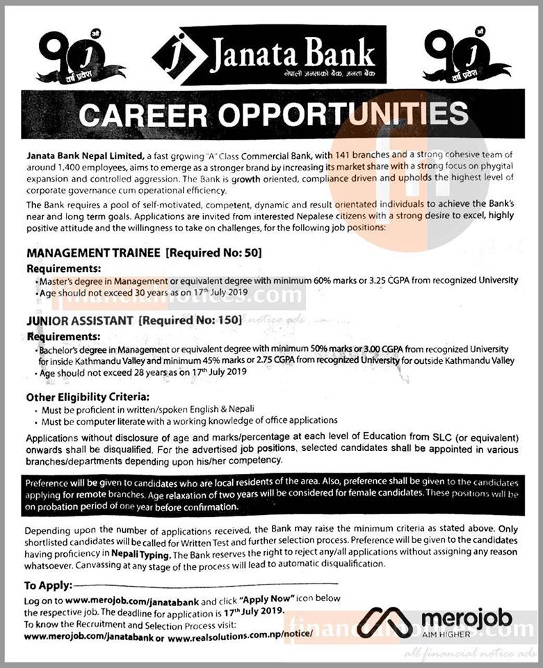 जनता बैंकले जुनियर असिस्टेन्ट पदका लागि १ सय ५० जना र म्यानेजमेन्ट ट्रेनीका लागि ५० जना कर्मचारी माग गरेको गरेको छ । म्यानेजमेन्ट ट्रेनीका लागि स्तानकोत्तर गरेको हुनुपर्ने र जुनियर असिस्टेन्टका लागि स्नातक भए पुग्ने बैंकले जनाएको छ ।