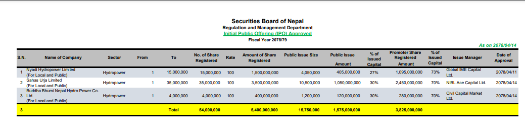 न्यादी हाइड्रोपावर कम्पनीले आयोजना प्रभाववित स्थानीय र सर्बसाधारणको लागि एक सय रुपैयाँ दरमा कुल १ अर्ब ५० करोड रुपैयाँ बराबरको १ करोड ५० लाख कित्ता आइपीओ निष्कानशको लागि अनुमति दिएको हो । शेयर निष्काशन तथा विक्री प्रबन्धकमा ग्लोबल आईएमई क्यापिटल रहेको छ । बोर्डले कम्पनीलाई असाउन ११ गते आइपीओ निष्कानशको लागि अनुमति दिएको हो ।