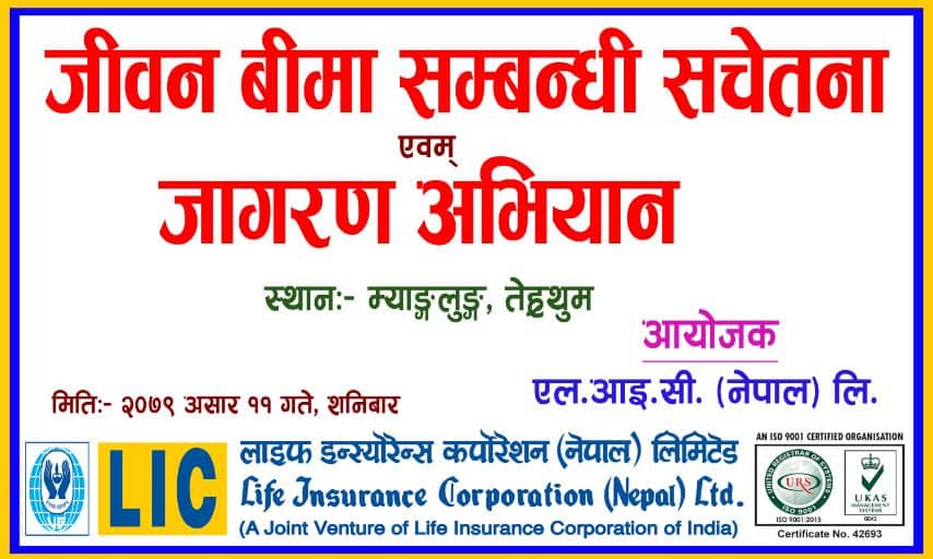 काठमाडौं । एलआइसी नेपालले तेर्ह्रथुमको म्याङलुङ, सुनसरीको रामधुनी र कालिकोटको मान्मामा जीवन बीमा सम्बन्धी सचेतना एवं जागरण अभियान कार्यक्रम सम्पन्न गरेको छ । कम्पनीले बीमा सम्बन्धी जनचेतना मुलक कार्यक्रम सञ्चालन गरेको हो ।