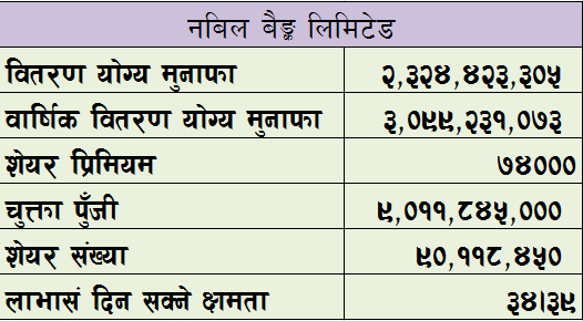 नबिल बैंकको तेश्रो त्रैमासको वित्तिय विवरण अनुसार कम्पनीको वितरण योग्य मुनाफा २ अर्ब ३२  करोड  रुपैयाँ  छ। कम्पनीले यही प्रगति अन्तिम त्रैमास सम्म गरेमा कम्पनीको वार्षिक वितरणयोग्य मुनाफा ३ अर्ब ९ करोड रुपैयाँ आऊँछ।