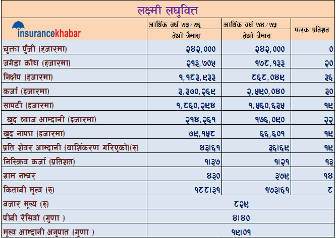 लक्ष्मी लघुवित्तले आफ्नो तेश्रो त्रैमास विवरण सार्वजनिक गरेको छ। कम्पनीले तेश्रो त्रैमास सम्म ७ करोड ९१ लाख खुद नाफा कमाएको छ। अघिल्लो आर्थिक वर्षको तेश्रो त्रैमास सम्म कम्पनीले ६ करोड ६६ लाख रुपैयाँ कमाएको थियो । चुक्ता पुँजी वृद्धि नभएको र खुद नाफामा आएको १९ प्रतिशतको वृद्धिको कारणले गर्दा कम्पनीको प्रति शेयर आम्दानीपनि १९ प्रतिशतले वृद्धि भएको छ । कम्पनीको प्रति शेयर आम्दानी ४३ रुपैयाँ रहेको छ, गत वर्ष तेश्रो त्रैमास सम्म आउँदा कम्पनीको प्रति शेयर आम्दानी ३६ रुपैयाँ थियो ।