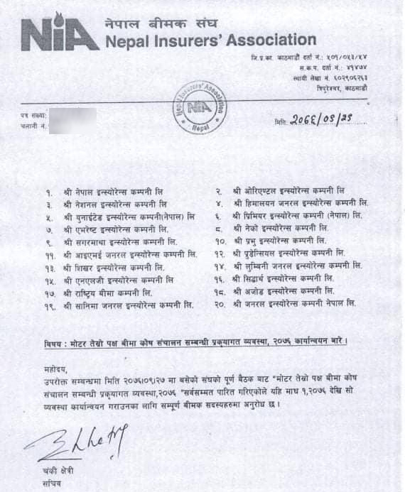 संघले २० वटै बीमा कम्पनीहरुलाई पत्र लेख्दै यही माघ १ गतेदेखि सवारी साधनको तेस्रो पक्ष बीमा पुलमार्फत सञ्चालन गर्न सुरु गरेको भन्दै सोही बमोजिम गर्न गराउन निर्देशन जारी गरेको छ । बीमक संघका सचिव चंकी क्षेत्रका अनुसार बीमक संघले बनाएको कार्यविधि पूर्ण बैठकले सर्वसम्मत रुपमा स्वीकृत गरेपछि माघ १ गतेदेखि तेस्रो पक्ष बीमा पुलमार्फत गर्न सुरु गरिएको हो ।
