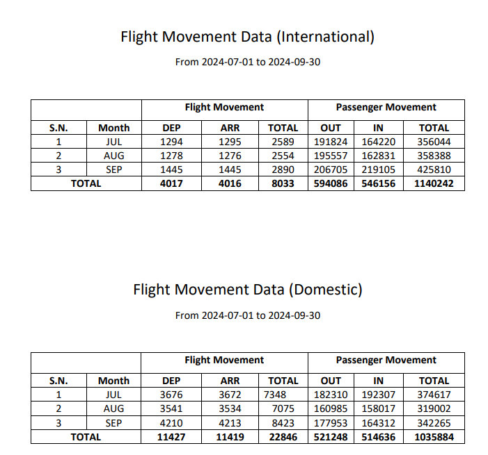 यसैगरी जुलाईदेखि सेप्टेम्बरसम्म आन्तरिकतर्फ ५ लाख २१ हजार २४८ यात्रु प्रस्थान गरेका छन् भने ५ लाख १४ हजार ६३६ यात्रु अवतरण गरेका छन्। आन्तरिकतर्फ उडान–अवतरण भने २२ हजार ८४६ भएका छन्।