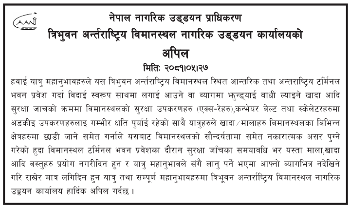 नेपाल नागरिक उड्डयन प्राधिकरण त्रिभुवन अन्तर्राष्ट्रिय विमानस्थल नागरिक उड्डयन कार्यालयले आज एक सूचना जारी गर्दै खादा वा मालामा प्रतिबन्ध लगाएको हो। हवाई यात्रु तथा तिनका आफन्तलाई लक्षित गरी खादा वा माला नल्याउन कार्यालयले अपिल गरेको छ।