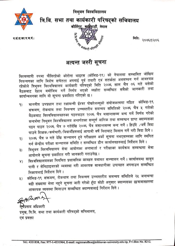 काठमाडौं । कोरोना भाइरसको त्रासले त्रिभुवन विश्वविद्यालयले शुक्रबार देखिका सबै पठन पाठन र परीक्षा स्थगित गर्ने निर्णय गरेको छ ।