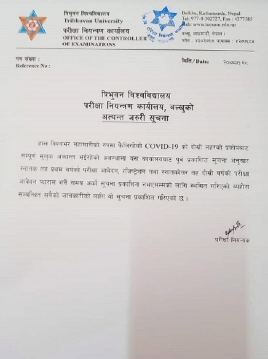 हाल विश्वभर महामारीका रुपमा फैलिरहेको कोरोना भाइरसको दोस्रो लहरको प्रकोपबाट भइरहेको अवस्थामा यसअघि प्रकाशित सूचनाअनुसार तय भएको परीक्षा आवेदन भर्ने समय स्थगित भएको परीक्षा नियन्त्रण कार्यालयले जनाएको छ।