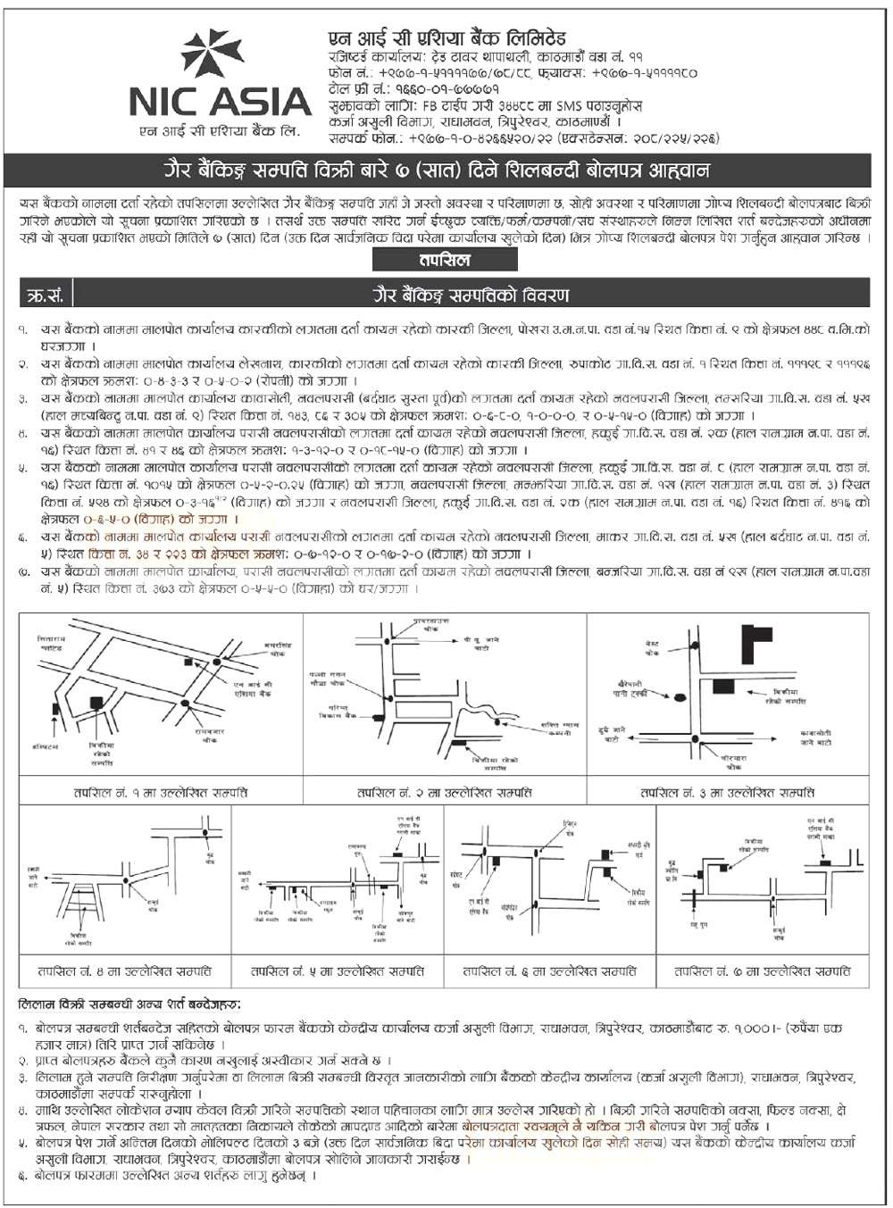 काठमाडौं । एनआइसी एशिया बैंक लिमिटेडले आफ्नो नाममा दर्ता रहेका थप ७ ठाउँको जग्गा बिक्री गर्ने भएको छ । बैंकले आफ्नो नाममा दर्ता रहेको थप सात ठाउँको जग्गा बिक्रीका लागि गोप्य शिलबन्दी बोलपत्र पेश गर्न आह्वान गरेको हो ।