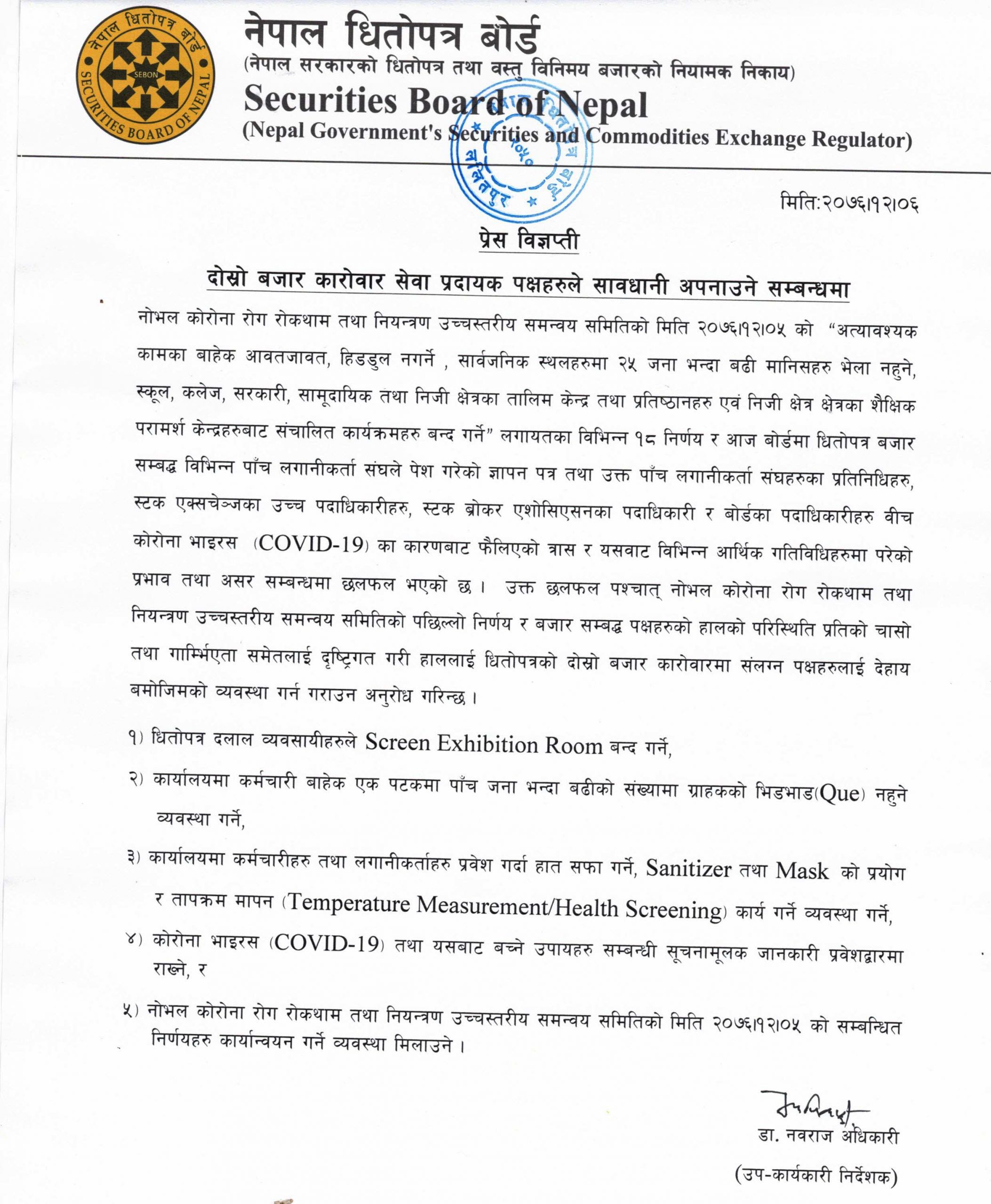 ४) शेयर ब्रोकरको कार्यालयको गेटमा कोरोना भाइरसबाट जोगिने उपायहरु राख्ने