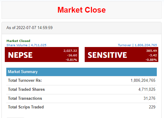 बिहीबार नेप्से सूचक १६.६० अंकले घटेको छ । सूचकमा ओरालो लागे सँगै कारोबार रकम पनि एक अर्ब ८० करोड रुपैयाँमा सिमित भएको छ । आज म्युचुअल फण्ड बाहेक सम्पुर्ण सूचक तथा उपसूचकमा गिरावट देखिएको छ ।