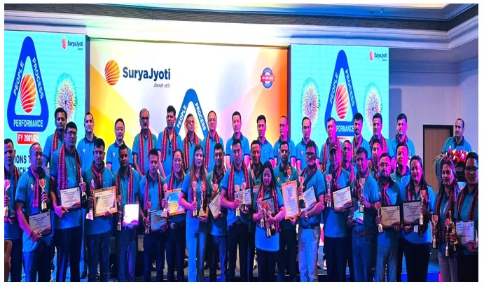 काठमाडौं । सूर्यज्योति लाइफ इन्स्योरेन्स कम्पनी लिमिटेडले देशभरका, प्रदेश प्रमुख, क्षेत्रिय प्रमुख, शाखा प्रमुखहरुको आर्थिक वर्ष २०८०/८१ ब्यवासायिक उपलब्धिको मूल्याङ्कन गर्दै उत्कृष्टता हासिल गर्ने कर्मचारीहरुलाई सम्मान गरेको छ। करिब २२० भन्दा बढी कर्मचारीहरुको उपस्थितिमा पोखरा स्थित होटल पोखरा ग्रण्डेमा सेल्स कन्भेन्सन २०८१/८२ सूर्यज्योति लाइफले भव्यताका साथ सम्पन्न गरेको हो ।