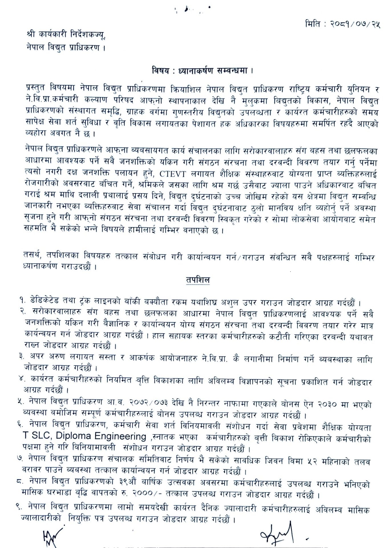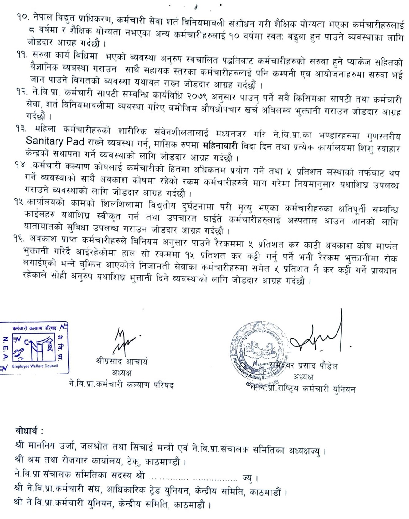 प्राधिकरणमा क्रियाशील नेविप्रा राष्ट्रिय कर्मचारी युनियन र नेविप्रा कर्मचारी कल्याण परिषद्ले संयुक्त रुपमा आज १६ बुँदे मागसहितको ध्यानाकर्षणपत्र कार्यकारी निर्देशक कुलमान घिसिङलाई बुझाउँदै असन्तुष्ट जनाएका हुन्। प्राधिकरणले आफ्नो व्यवसायगत कार्य सञ्चालनका लागि सरोकारवालाहरुसँग बहस तथा छलफलका आधारमा आवश्यक पर्ने सबै जनशक्तिको यकिन गरी संगठन संरचना तथा दरबन्दी विवरण तयार गर्नुपर्नेमा त्यसो नगरेको ध्यानाकर्षणपत्रमा उल्लेख छ।