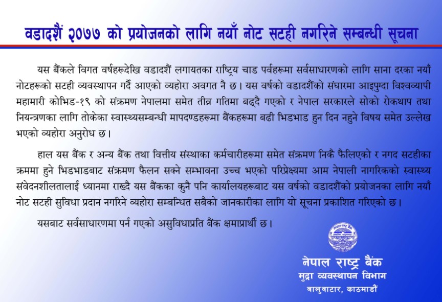 नेपाल राष्ट्र बैंकका प्रबक्ता गुणाकर भट्टले भने, ‘कोभिड–१९ का कारण लाइन लगाएर दशैंमा नयाँ नोट वितरण गर्ने अवस्था छैन ।’ राष्ट्र बैंकले जनतालाई नोट साट्ने।नसाट्नेबारे प्रष्ट पार्न आइतबार सूचना जारी गरेर स्पष्ट पारिएको जनाएकोछ । राष्ट्र बैंकद्वारा जारी सुचनामा भनिएको छ, ‘हाल यस बैंक र अन्य बैंक तथा वित्तीय संस्थाका कर्मचारीहरुमा समेत संक्रमण निकै फैलिएको र सटहीका क्रममा हुने भिडभाडबाट संक्रमण फैलन सक्ने सम्भावना उच्च भएको परिप्रेक्ष्यमा आम नेपाली नागरिकको स्वास्थ्य संवेदनशीलतालाई ध्यानमा राख्दै यस बैंकका कुनै पनि कार्यालयहरुबाट यस वर्षको बडा दशैंको प्रयोजनका लागि नयाँ नोट सटही सुविधा प्रदान नगरिने व्यहोरा सम्बन्धित सबैको जानकारीको लागि लागि यो सूचना प्रकाशित गरिएको छ ।’