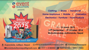 दशैंको अवसर पारेर आगामी बिहीबारदेखिे भृकुटीण्डपमा स्टक क्लियरेन्स मेला आयोजना गर्न भएको छ । दशैंका लागि सस्तो मूल्यमा वस्तु तथा सेवाको बिक्री बितरण गर्ने लक्ष्यका साथ आयोजना हुन लागेको मेलामा बजारको तुलनामा सस्तोमा सामान उपभोक्ताले किन्न पाइन्छ ।