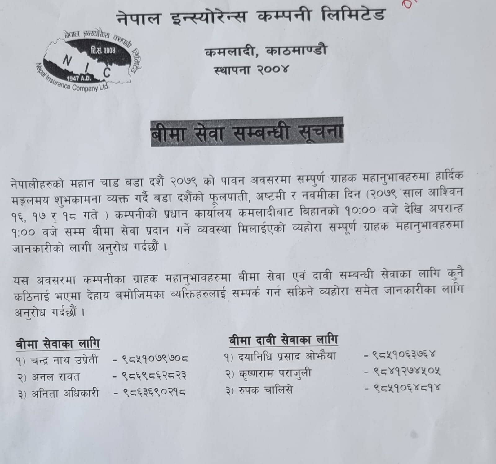 यसका साथै कम्पनीले बीमा सम्बन्धी केही थप बुझन र जानकारी लिनका लागि सम्बन्धीत व्यक्ति खटाएको छ । जहाँ बीमा सेवाका लागि ३ जना, बीमा दाबी सेवाको लागि पनि ३ जना गरी ६ जना व्यक्ति खटाएको छ । दशै बीदामा बीमा सम्बन्धी केही समस्या परेमा कम्पनीले यी व्यक्तिलाई सम्पर्क गर्न भनेको छ ।