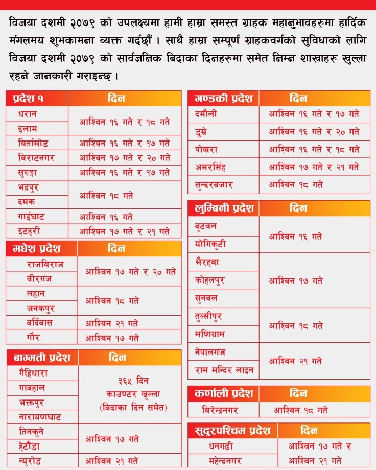 काठमाडौं । सनराइज बैंक लिमिटेडले दशैंको बिदामा पनि बैंकिङ सेवा दिने भएको छ । आफ्ना केही सीमित शाखा कार्यालयबाट बैकिङ्ग सुविधा दिने भएको एक सुचना जारी गर्दै जनाएको छ । बैंकले दशैंमा हुने एक साता विदामा आफ्ना ग्राहकहरुलाई बैकिङ्ग सेवा सुविधा दिने हेतुले केही सीमित शाखाहरु संचालनमा ल्याउन लागेको जनाएको छ ।