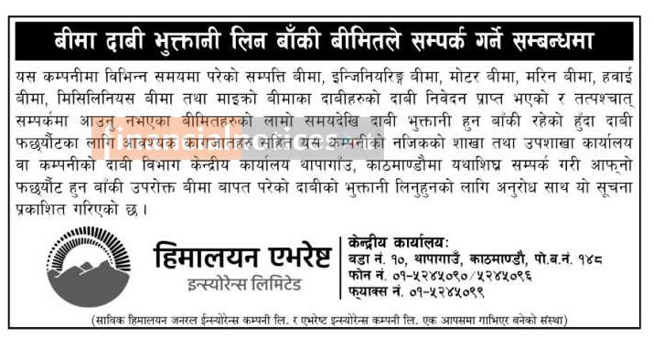 दाबी भुक्तानी लिन बाँकी बीमितलाई सम्पर्क गर्न हिमालयन एभरेष्ट इन्स्योरेन्सको आग्रह
