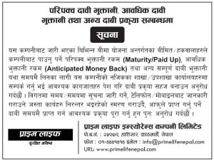 काठमाडौं । प्राइम लाइफ इन्स्योेरेन्सल कम्मपनी लिमिटेडले दाबी भुक्तानी लिन बीमित समक्ष अनुरोध गरेको छ ।
