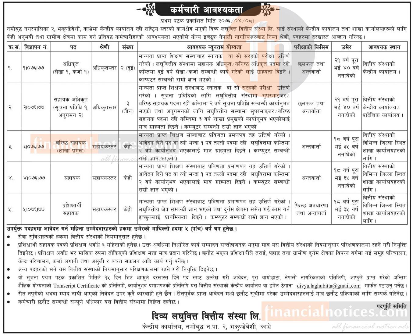 दिव्य लघुवित्त वित्तीय संस्थाले विभिन्न पदमा कर्मचारी माग गरेको छ । संस्थाले अधिकृत, सहायक अधिकृत, (सूचना प्रविधि, अनुगमन), वरिष्ठ सहायक (शाखा प्रमुख), सहायक र प्रशिक्षार्थी सहायक पदमा कर्मचारी माग गरेको हो ।