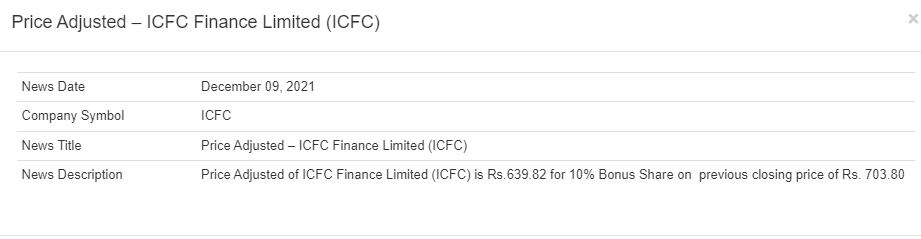 त्यस्तै, नेप्सेले आइसिएफसि फाइनान्सको १० प्रतिशत बोनश शेयर पछिको मुल्य समायोजन गरी ६३९ रुपैयाँ ८२ पैसा कायम गरेको छ । कम्पनीको बुधवार अन्तिम कारोबार मुल्य ७०३ रुपैयाँ ८० पैसाको आधारमा शेयर मुल्य समायोजन गरेको हो ।