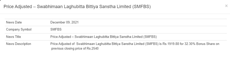 नेप्सेले स्वाभिमान लघुवित्तको ३२ दशमलव ३० प्रतिशत बोनश शेयरको समायोजन पछि शेयर मूल्य १ हजार ९१९ रुपैयाँ ८८ पैसा कायम गरेको छ । कम्पनीको अघिल्लो कारोबारको दिन कायम अन्तिम शेयर मूल्य २ हजार ५४० रुपैयाँको आधारमा शेयर मूल्य समायोजन भएको हो ।