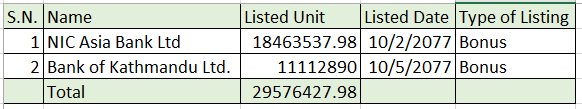 एनआइसी एशिया बैंक लिमिटेडको एक करोड ८४ लाख ६३ हजार ५ सय ३७ दशमलव ९८ कित्ता बोनस शेयर सूचिकृत भएको हो भने बैंक अफ काठमाण्डू लिमिटेडको एक करोड ११ लाख १२ हजार ८ सय ९० कित्ता बोनस शेयर सूचिकृत भएको हो ।