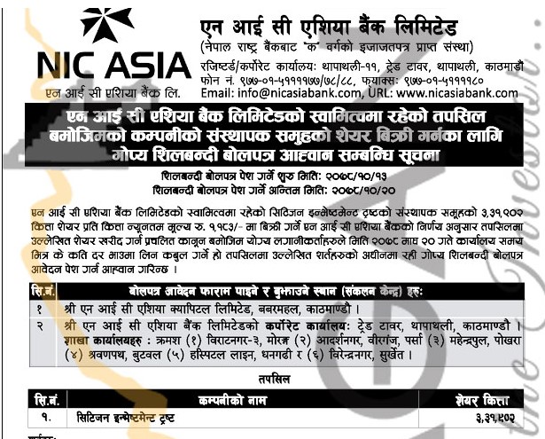 त्यस्तै बैंकले नागरिक लगानी कोषको ३ लाख ३१ हजार ९ सय २ कित्ता संस्थापक शेयर लिलाम गर्न लागेको हो। यी शेयरको न्युनतम मूल्य ११ सय ८३ रुपैयाँ कायम गरेको छ ।