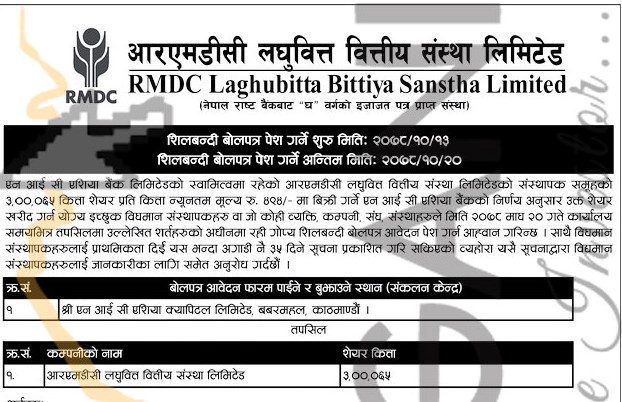 बैंकले विक्री गर्न लागेको यी कम्पनीको लिलामी शेयरमा आज माघ १३ गतेदेखि माघ २० गतेसम्म आवेदन दिन सकिनेछ । बैंकले आरएमडिसी लघुवित्तको ३ लाख ६५ कित्ता संस्थापक शेयर लिलाम गर्न लागेको हो । बैंकले शेयरको न्युनतम मूल्य ४९४ रुपैयाँ कायम गरेको छ । लगानीकर्ताले सो वाभन्दा बढी रकम कबुल गरेर आवेदन दिनु पर्नेछ ।
