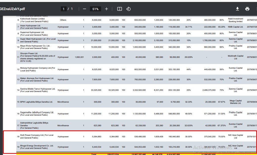 काठमाडौं । नेपाल धितोपत्र बोर्डले दोल्ती पावर कम्पनी र भुगोल इनर्जी डेभलपमेन्ट कम्पनीलाई आइपीओ निष्काशन गर्न अनुमति दिएको हो । बोर्डले दोल्ती पावर कम्पनीलाई आयोजना प्रभावित स्थानिय र सर्वसाधारणको लागि आइपीओ निष्काशन गर्न अनुमति दिएको हो । कम्पनीले १६ करोड ९ लाख ४५ हजार ८०० रुपैयाँ बराबरको १६ लाख ९ हजार ४५८ कित्ता शेयर निष्काशन गर्नेछ ।
