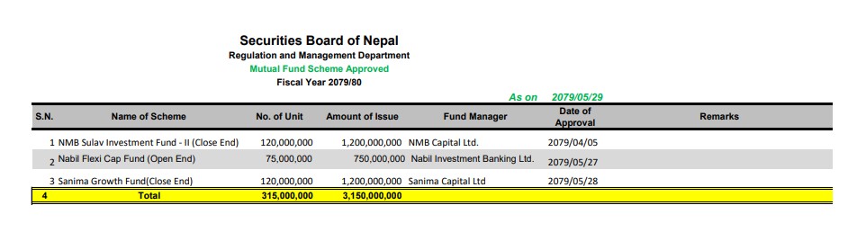 त्यसैगरी सानिमा ग्रोथ फण्डले १२ करोड इकाई निष्काशन गर्नेछ । यस फण्डको योजना ब्यवस्थापक सानिमा क्यापिटल लिमिटेड रहेको छ ।