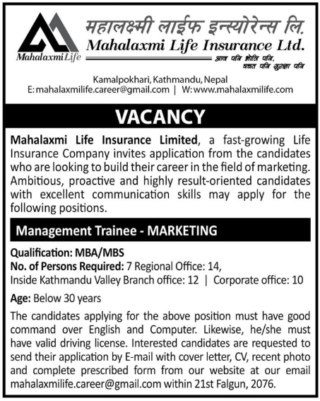 त्यस्तै, महालक्ष्मी लाइफ इन्स्योरेन्स कम्पनीले म्यानेजमेन्ट ट्रेनीका लागि कर्मचारीको माग गरेको हो । क्षेत्रिय कार्यालयका लागि १४ जना, उपत्यका बाहिरका विभिन्न शाखाक कार्यालयका लाष्गि १२ जना, र कर्पोरेट अफिसका लागि १० जना गरी कुल ३६ जना कर्मचारीको माग गरेको हो ।