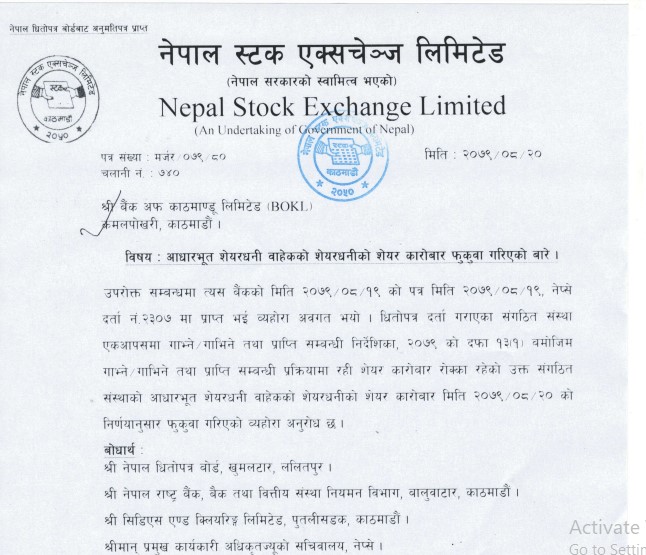 काठमाडौं । ग्लोबल आइएमई बैंक र बैंक अफ काठमाण्डूको शेयर कारोबार फुकुवा भएको छ । नेप्सेको आज मंसिर २० गतेको निर्णय अनुसार कम्पनीको शेयर कारोबार फुकुवा भएको हो ।