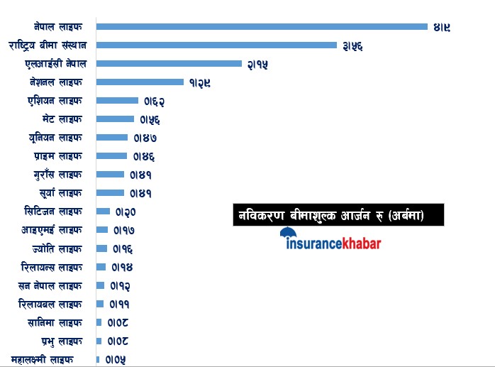 सिटिजन लाइफले २० करोड रुपैयाँ, आइएमई लाइफले १७ करोड रुपैयाँ, ज्योति लाइफले १६ करोड रुपैयाँ, रिलायन्स लाइफले १४ करोड रुपैयाँ, सन नेपाल लाइफले १२ करोड रुपैयाँ, रिलायबल लाइफले १४ करोड रुपैयाँ, प्रभु लाइफले ८ करोड रुपैयाँ, सानिमा लाइफले ८ करोड रुपैयाँ र महालक्ष्मी लाइफले ५ करोड रुपैयाँ नविकरण जीवन बीमाशुल्क आर्जन गरेको छ ।