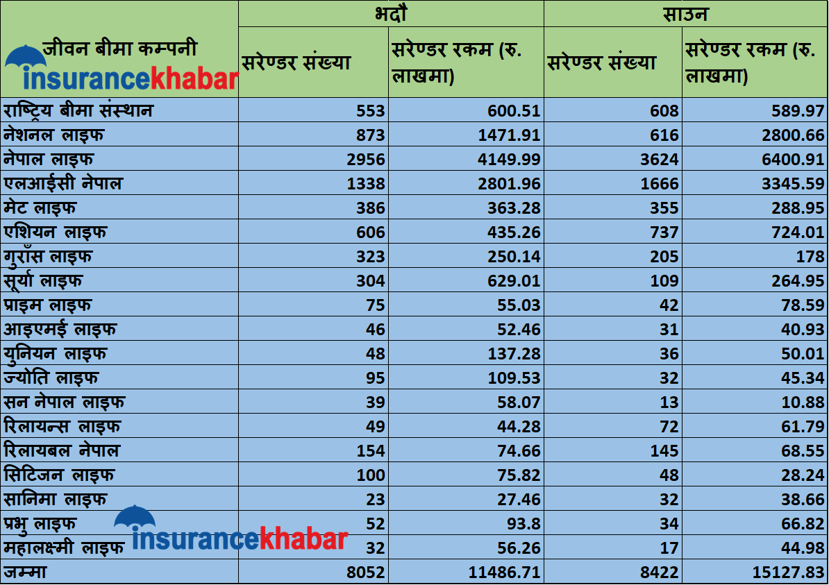 चालु आर्थिक वर्षको पहिलो महिना अर्थात साउन मसान्तमा जीवन बीमा कम्पनीहरुमा एक अर्ब ५१ करोडको सरेण्डर भएको थियो । साउनमा ८ हजार ४२२ वटा पोलिसी सरेण्डर भएको छ । यहि क्रमले भदौमा पनि निरन्तरता भएको छ । भदौमा एक अर्ब १४ करोड रुपैयाँको सरेण्डर भएको छ । भदौ एक महिनामा मात्रै ८ हजार ५२ वटा पोलिसी सरेण्डर भएका छन् ।