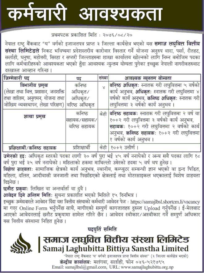 समाज लघुवित्तले कनिष्ठ अधिकृतका लागि ४ जना, कनिष्ठ सहायकका लागि केही र प्रशिक्षर्थीका लागि केही संख्यामा कर्मचारीको माग गरेको छ ।