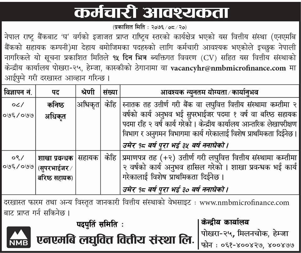 त्यस्तै, एनएमबि लघुवित्तले कनिष्ठ अधिकृत र शाखा प्रबन्धकको लागि केही संख्यामा कर्मचारीको माग गरेको हो ,