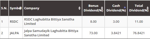 त्यसैगरी जाल्पा सामुदायिक लघुवित्तले आर्थिक वर्ष २०७८/७९ को मुनाफाबाट आफ्ना शेयरधनीलाई ७६ दशमलव ८४२१ प्रतिशत लाभांश दिने घोषणा गरेको हो । जसअनुसार कम्पनीले आर्थिक वर्ष २०७८/७९ सम्म सञ्चित रहेको मुनाफाबाट हाल कायम रहेको चुक्ता पुँजीको ७३ प्रतिशत बोनश शेयर तथा कर प्रयोजनका लागि ३ दशमलव ८४२१ प्रतिशत नगद लाभांश गरि कुल ७६ दशमलव ८४२१ प्रतिशत लाभांश बितरण गर्ने प्रस्ताव गरेको हो।