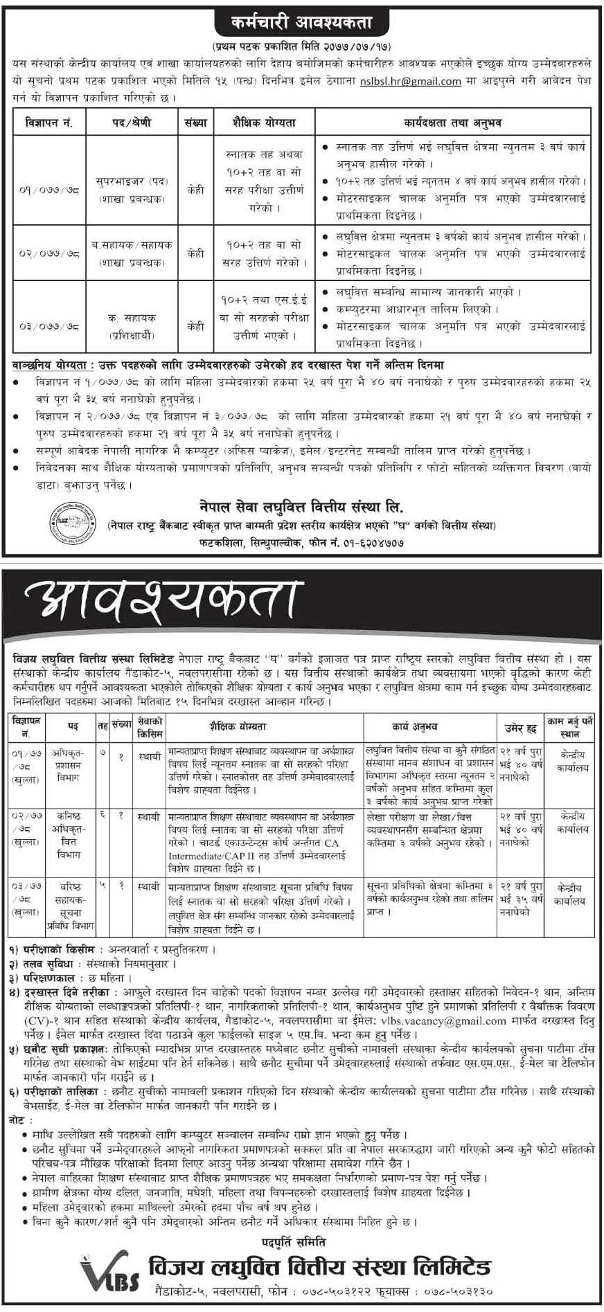 काठमाडौं । नेपाल सेवा लघुवित्त वित्तीय संस्था लिमिटेड र विजय लघुवित्त वित्तीय संस्था लिमिटेडले विभिन्न पदका लागि कर्मचारीको माग गरेको छ ।