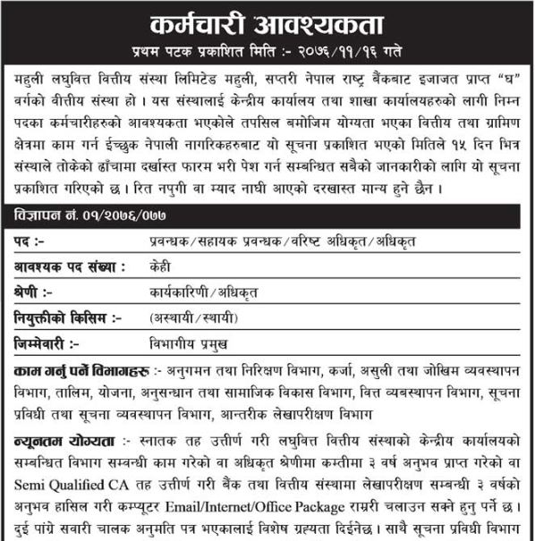 त्यस्तै, महुली लघुवित्तमा जागिर गर्न ईच्छुक तथा योग्यता पुगेकाले विज्ञापन प्रकाशित भएको मितिले १५ दिनभित्र आवेदन दिइसक्नुपर्ने जनाएको छ ।
