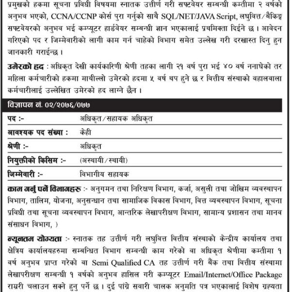 कर्णाली डेभलपमेन्ट बैंकले आफ्ना केन्द्रीय कार्यालयका लागि कर्मचारीको माग गरेको हो । ईच्छुक तथा योग्यता पुगेकाले मार्च १३ सम्म आवेदन दिइसक्नुपर्ने जनाएको छ ।